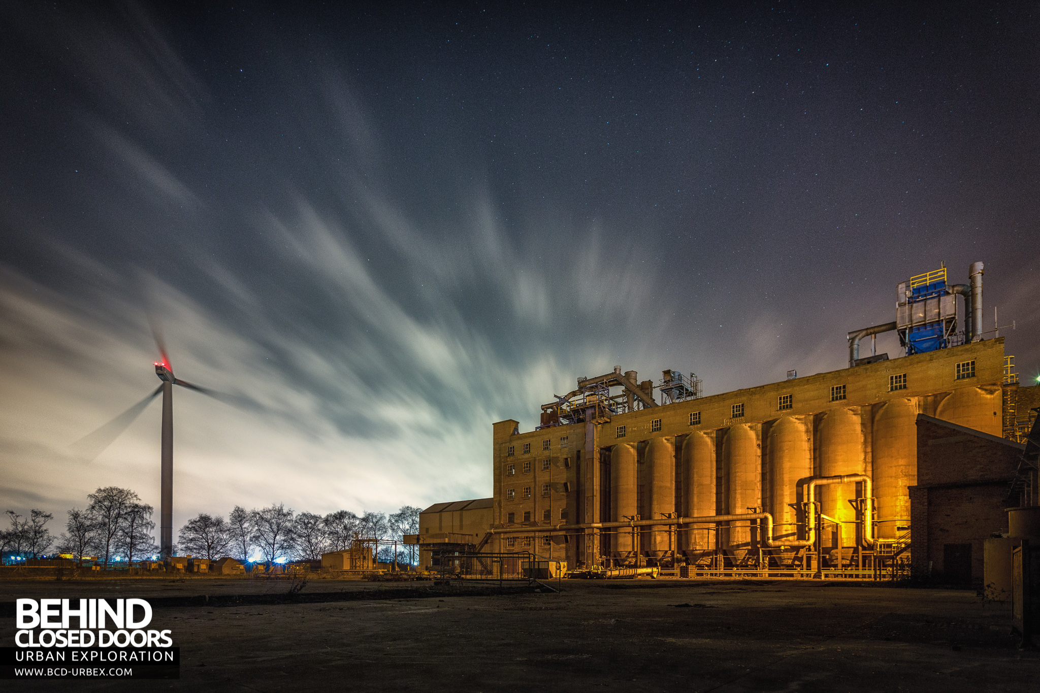 British Celanese, Spondon – Part of the factory and wind turbine at night